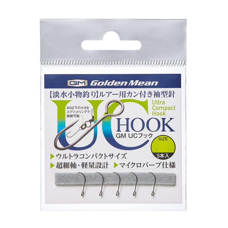 中央漁具の中堅ブランドのゴールデンミーンのUCフックです。こちら、小物釣りでは定番の袖型の釣り針にルアーに付けられるように輪っかが付いたものになります。釣り針にはいろんな形がありますが、やはり淡水小物類には袖針が良いのは明白で、これを製品化した中央漁具ゴールデンミーンには感謝です。